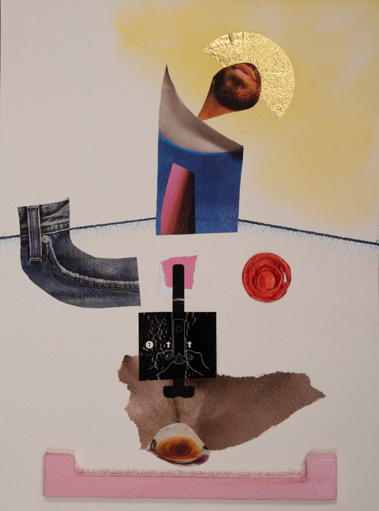 Medium: Paper collage, wine foil, foam packing strip, watercolor and colored pencil on watercolor paper