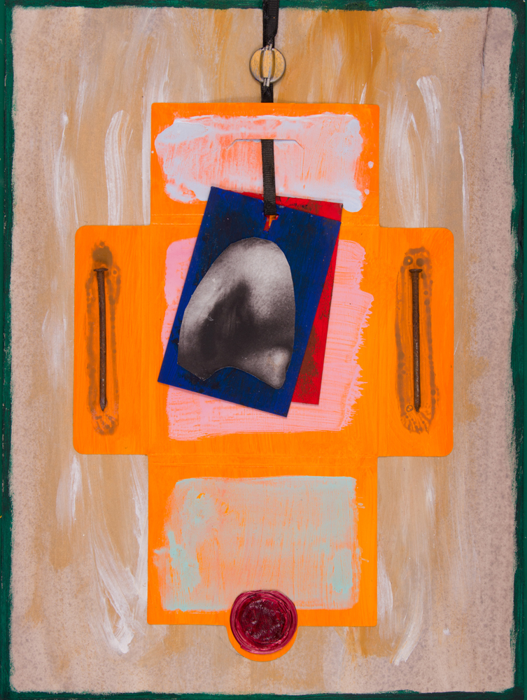 Medium: Acrylic, cardboard, wine foil, nails, ribbon with metal "seal", gold on watercolor paper